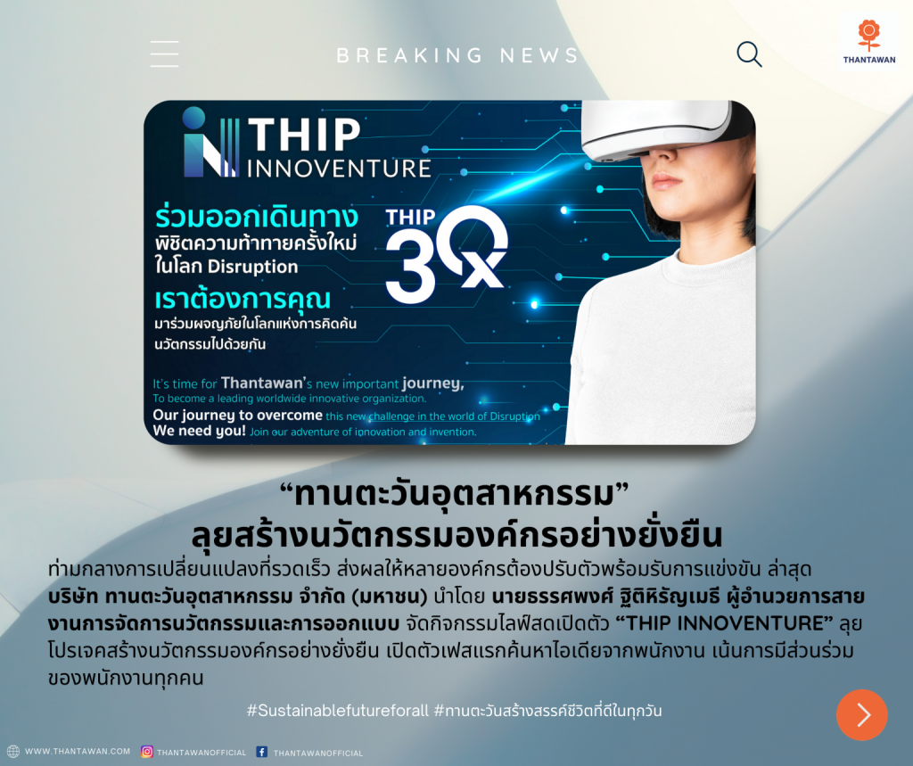 Trong bối cảnh thay đổi nhanh chóng và khó lường, việc này giúp các tổ chức tự điều chỉnh để thích ứng với cạnh tranh. Gần đây, Công ty Cổ phần Công nghiệp Thantawan (THIP), nhà sản xuất và phân phối bao bì đạt chuẩn quốc tế, do ông Thadpong Thitihiranmethi, Giám đốc Bộ phận Đổi mới & Thiết kế dẫn dắt, đã tổ chức buổi phát trực tiếp ra mắt “THIP INNOVENTURE”, một dự án đổi mới bền vững trong tổ chức. Dự án bắt đầu với giai đoạn đầu tư duy sáng tạo ý tưởng từ nhân viên hàng ngày đến cấp điều hành, nhấn mạnh sự tham gia của tất cả các phòng ban. Chúng tôi cũng tăng cường năng lực cho các nhà sáng tạo bằng việc bổ sung kỹ năng và kiến thức cần thiết, giúp họ biến ý tưởng thành hành động thực tế.